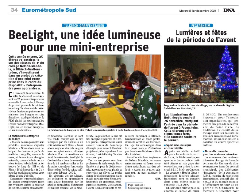 Mentor depuis septembre 2017, j’ai le plaisir d’accompagner en 2021-2022 les élèves du collège Nelson Mandela à Illkirch dans cadre de leur projet de mini-entreprise "BeeLight".